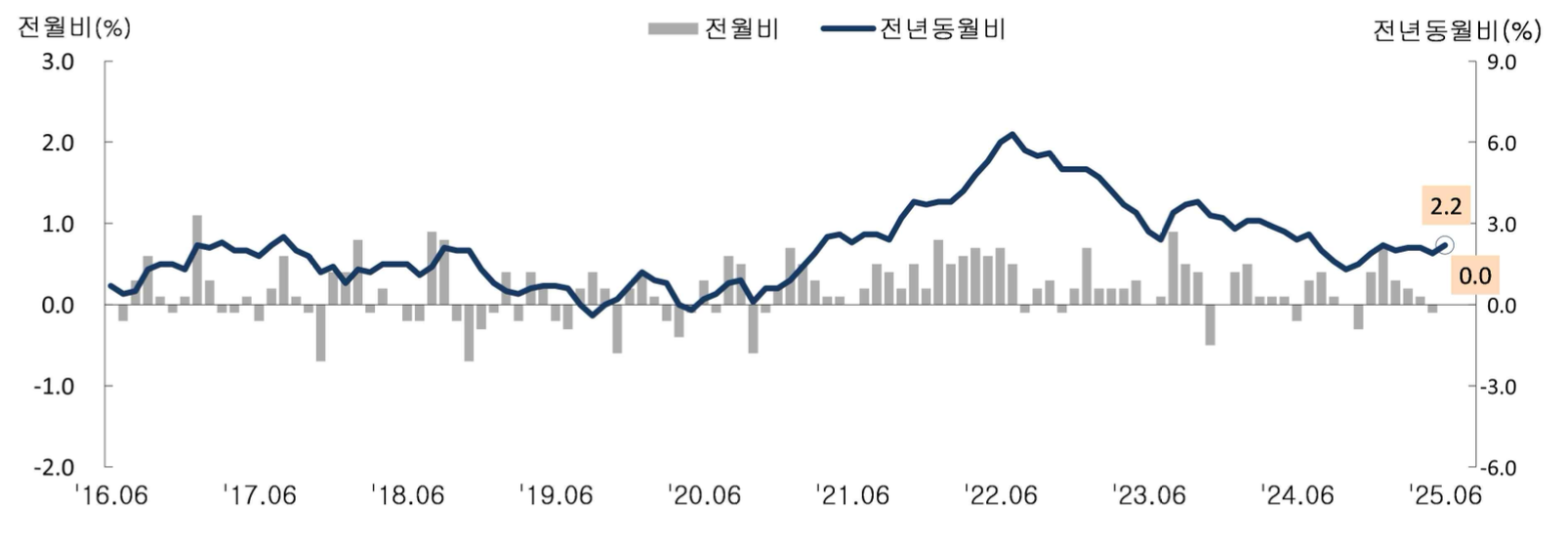 근원물가: 변동성이 큰 식료품과 에너지를 제외한 지수로, 전년동월대비 2.0% 상승하며 지난달과 같은 수준을 유지했습니다. 물가의 기조적인 흐름 자체는 아직 안정적이라는 의미입니다.