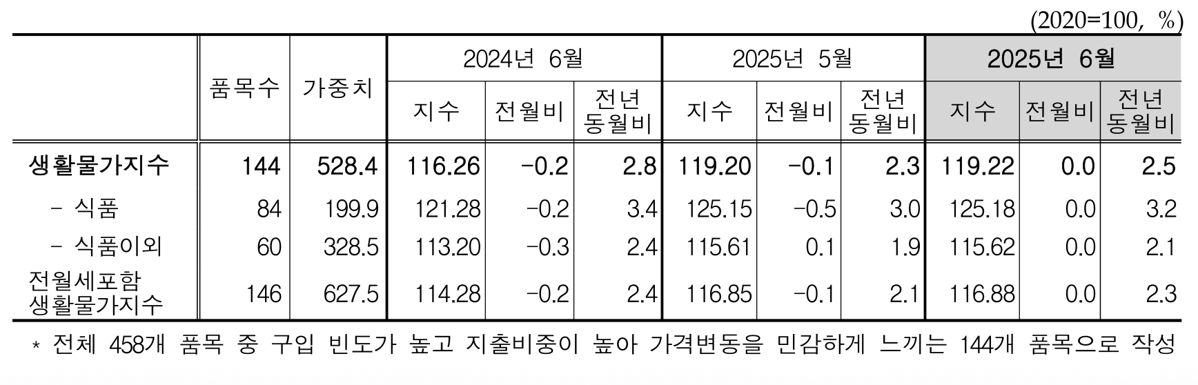 생활물가지수: 체감물가에 가까운 이 지수는 전년동월대비 2.5% 상승했습니다. 실제 장바구니 부담이 전체 평균보다 더 컸다는 뜻입니다.