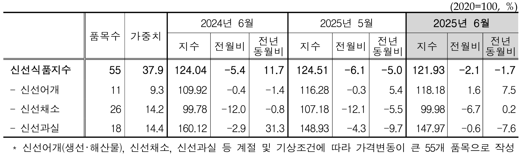 신선식품지수: 전년동월대비 1.7% 하락하며 물가 안정에 도움을 주었습니다. 다만 5월(-5.0%)에 비해 하락 폭은 줄었습니다.